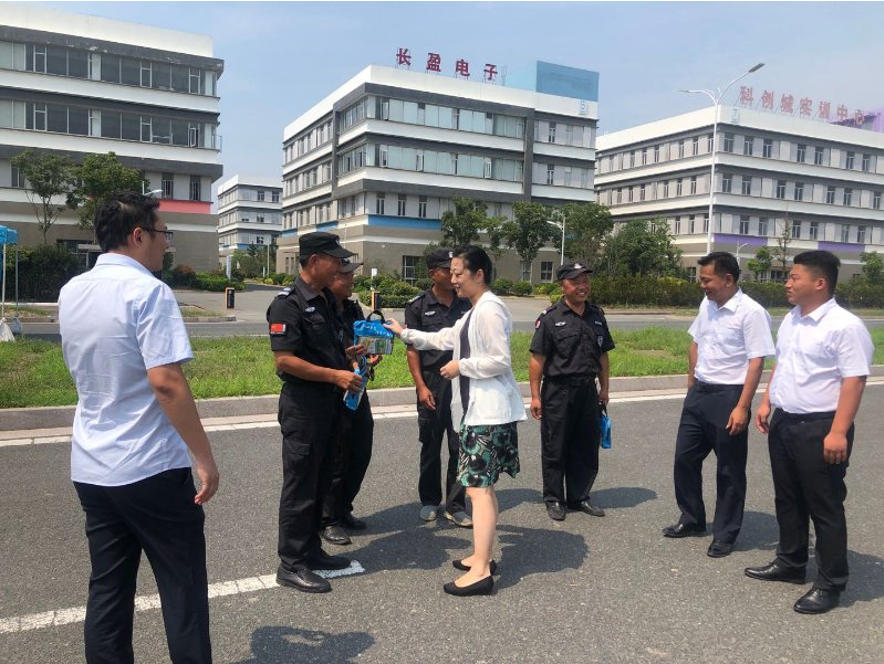 本次高溫慰問活動由產(chǎn)業(yè)公司副總經(jīng)理尤麗華帶隊,深入工作一線,分別向教學區(qū)、產(chǎn)業(yè)區(qū)及十里藍院一線保安、保潔等工作人員送上防暑降溫慰問品。